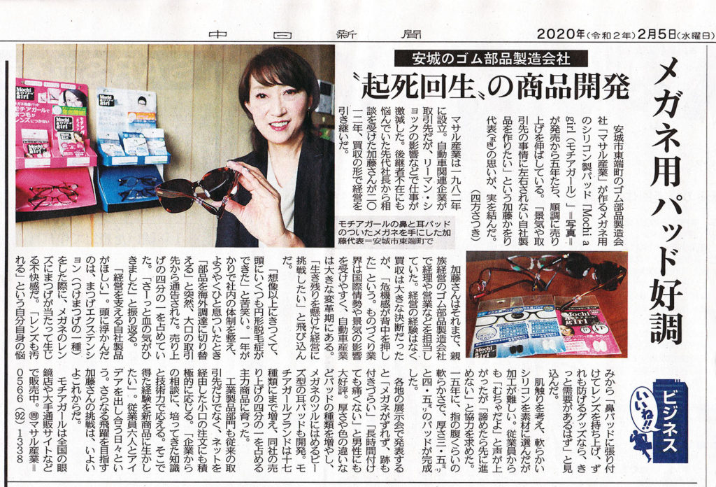 2月5日付の中日新聞西三河版で掲載されると、モチアガール(R)を取り扱ってくださっている安城市のメガネの杉友さんにも、さっそく